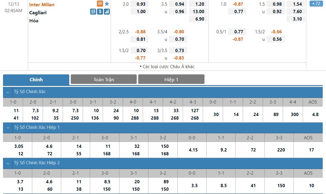 Inter sẽ được đánh giá cao hơn Cagliari rất nhiều ở kèo đấu này. Tỷ lệ cược của Inter chỉ là 1 ăn 1.20 trong khi đó Cagliari có tỷ lệ cược lên tới 1 ăn 13.00. Tỷ số hòa có tỷ lệ cược là 1 ăn 6.90. Cagliari vẫn đang tỏ ra không quá hiệu quả. Trong khi đó Inter tại Serie A đang chơi tốt và họ sẽ có chiến thắng. Cửa trên Inter vẫn sẽ là lựa chọn cho kèo đấu này.