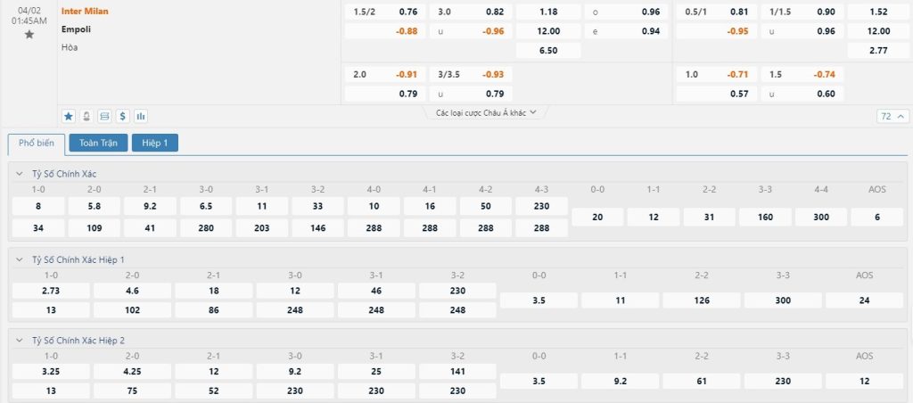 Trong 5 trận đấu gần nhất của mình, Inter Milan đã có 5 trận đấu mang về được cho mình ít nhất là 1 bàn thắng trong hiệp đấu đầu tiên. Còn với Empoli, đội bóng này đã có 1 lần làm được điều này trong 45 phút đầu tiên. Với tỷ lệ kèo hiệp 1 là -3/4 thì các nhà đầu tư nên tin tưởng vào đội chủ nhà ở trong hiệp đấu đầu tiên này.