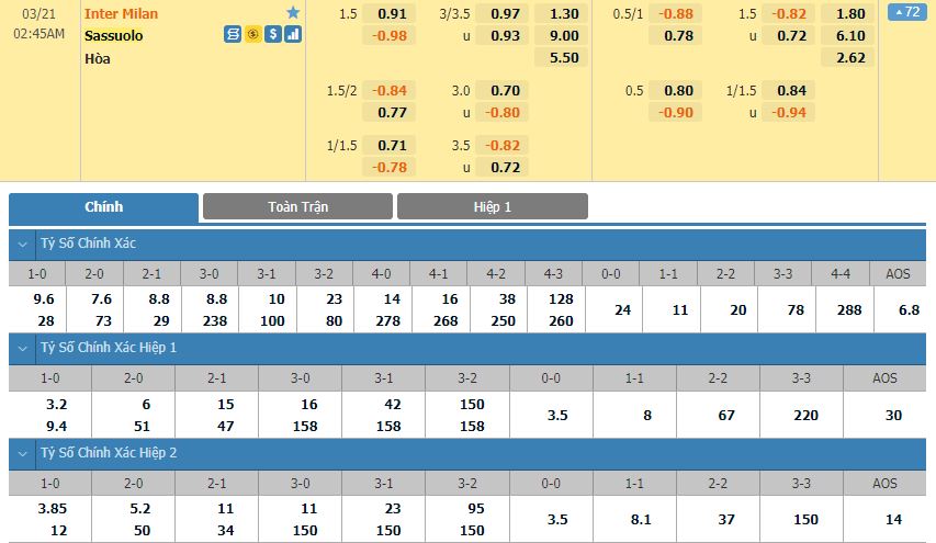 Soi kèo châu Á Inter Milan vs Sassuolo