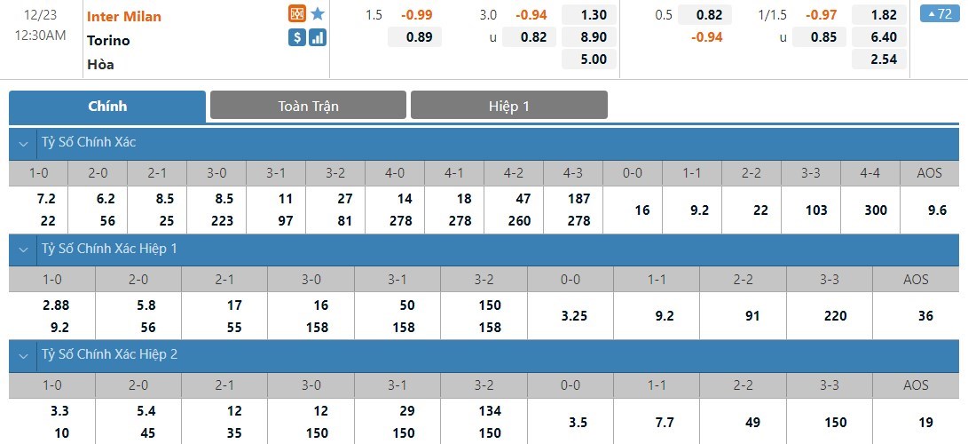 Soi kèo châu Á Inter Milan vs Torino