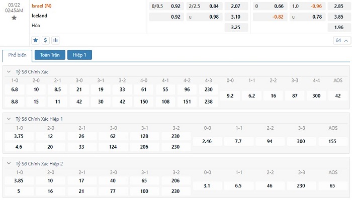 Kèo châu Á toàn trận: Israel -1/4 (FT)