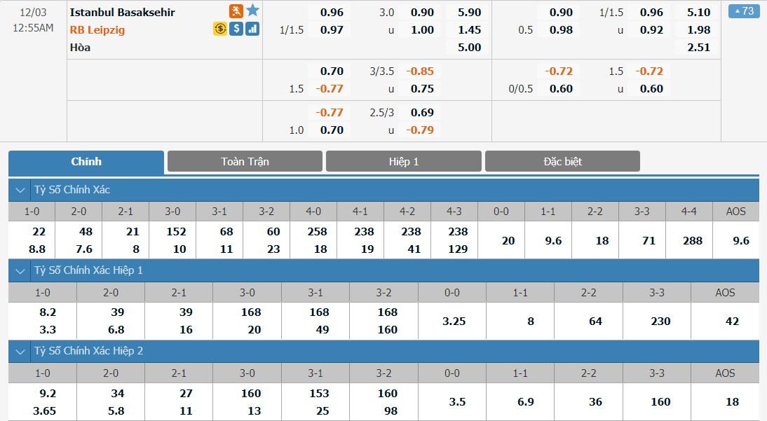 RB Leipzig vẫn được đánh giá cao hơn Istanbul Basaksehir khá nhiều ở trận này. Đội khách chỉ có tỷ lệ cược ở mức 1 ăn 1.45 trong khi đội chủ nhà có tỷ lệ cược lên tới 1 ăn 5.90. Tỷ số hòa có tỷ lệ 1 ăn 5.00. Đây là giai đoạn mà Istanbul Basaksehir đang có phong độ không cao. Phải đón tiếp một đối thủ có trình độ nhỉnh hơn mình khá nhiều, Istanbul Basaksehir sẽ khó để có thể tạo ra được bất ngờ.