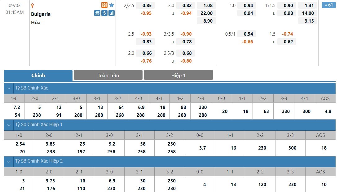 Soi kèo tài xỉu, kèo tỷ số Italia vs Bulgaria