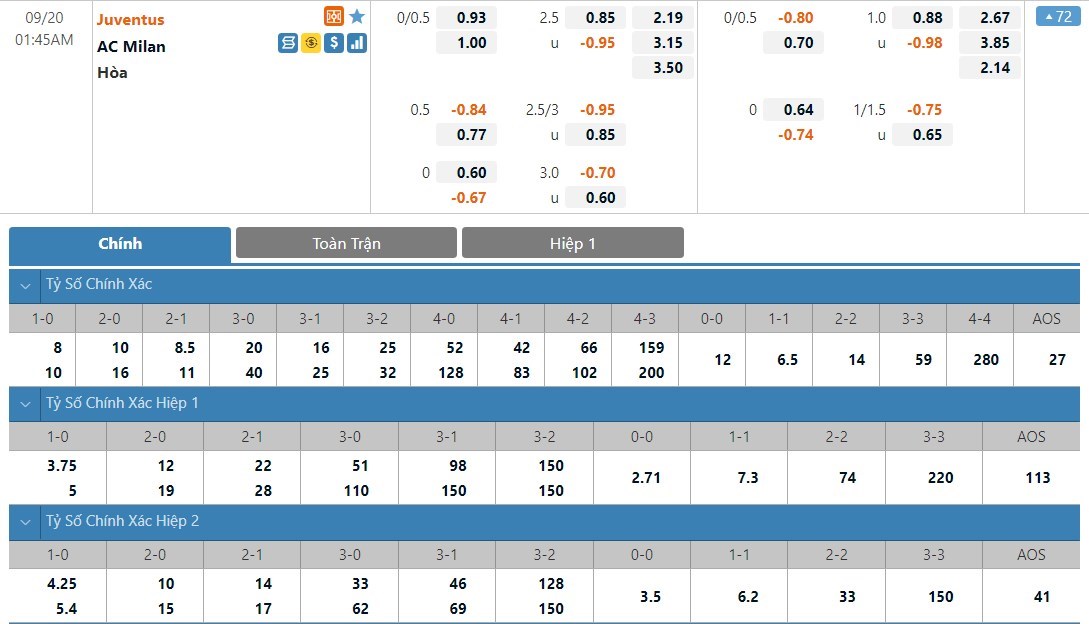 Soi kèo tài xỉu, kèo tỷ số Juventus vs AC Milan