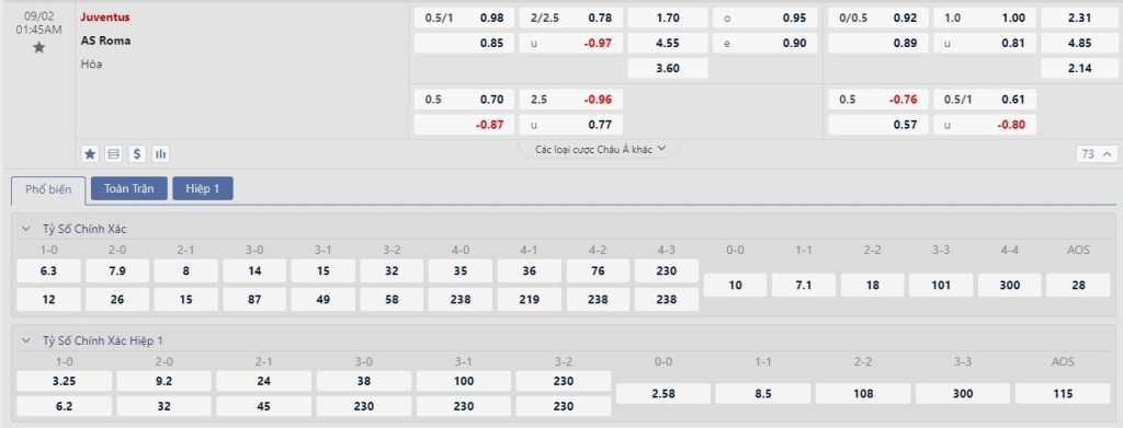 Soi kèo tài xỉu, kèo tỷ số Juventus vs AS Roma
