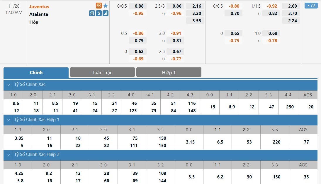 Dự đoán kèo tỷ số hiệp 1: Juventus 1-1 Atalanta