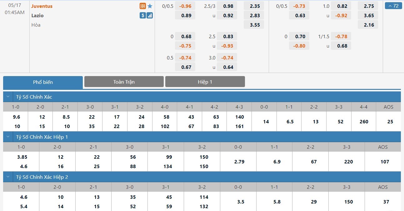 Kết quả Juventus thắng trận này có tỷ lệ cược là 1 ăn 2.35 trong khi đó kết quả Lazio thắng trận có tỷ lệ cược cao hơn đôi chút với 1 ăn 2.83. Tỷ số hòa có tỷ lệ cược là 1 ăn 3.55. Juventus ở giai đoạn cuối mùa đang thi đấu khá tốt. Được chơi trên sân nhà trước một Lazio vẫn đang chưa có được sự ổn định để có thể tạo ra bất ngờ trước những đội bóng lớn, Juventus sẽ có 3 điểm ở trận này. Cửa trên Juventus sẽ là lựa chọn được đánh giá cao hơn.