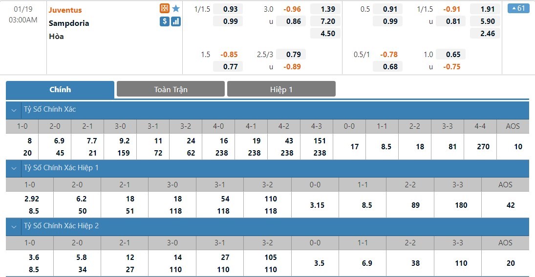 Soi kèo tổng quát Juventus vs Sampdoria