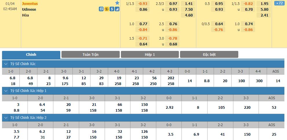 Soi kèo tài xỉu, kèo tỷ số Juventus vs Udinese