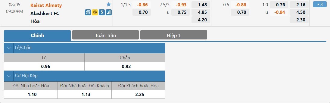 Tỷ lệ cược của Kairat và Alashkert ở kèo đấu này sẽ có sự chênh lệch rất lớn. Kairat có tỷ lệ cược chỉ là 1 ăn 1.48 trong khi đó Alashkert có tỷ lệ cược lên tới 1 ăn 4.85. Tỷ số hòa có tỷ lệ cược là 1 ăn 4.20. Kairat đang nắm khá nhiều lợi thế ở trận này và có thể sẽ vất vả nhưng đội chủ nhà vẫn sẽ có chiến thắng.