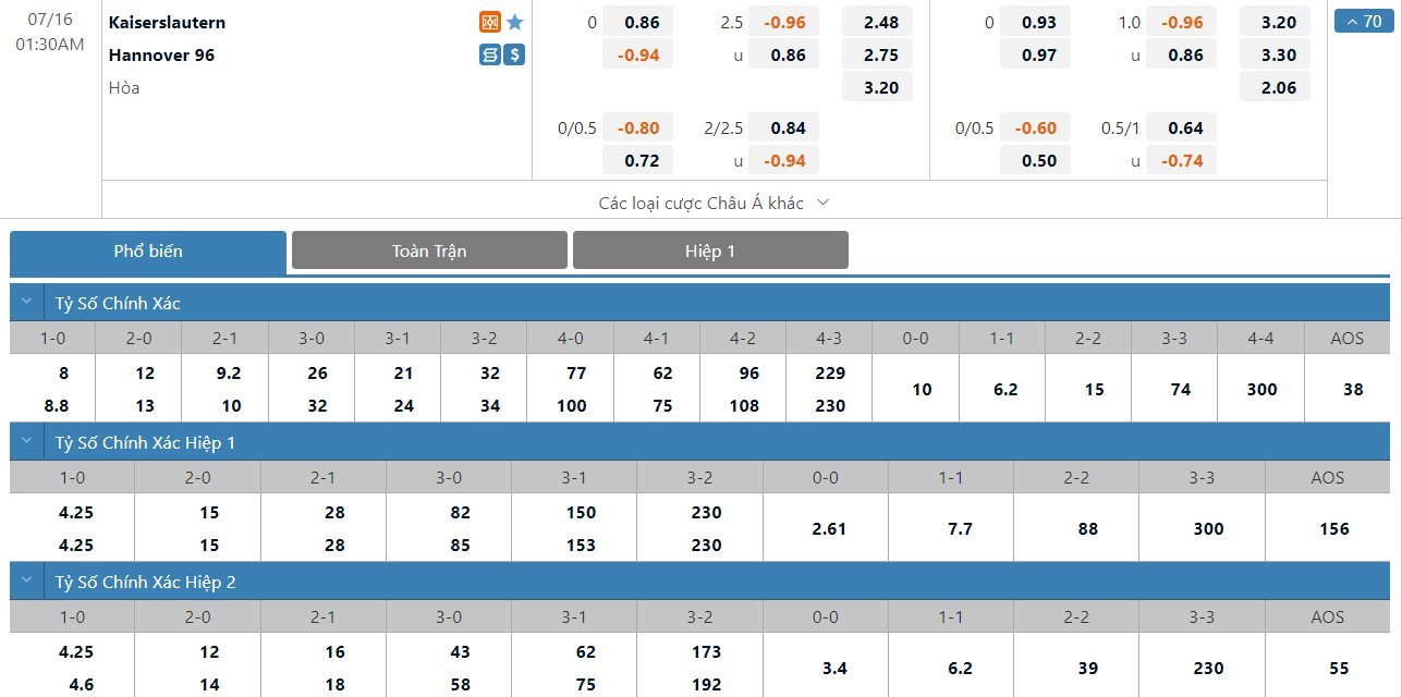 Soi kèo Kaiserslautern vs Hannover 96, 1h30, 16/7/2022