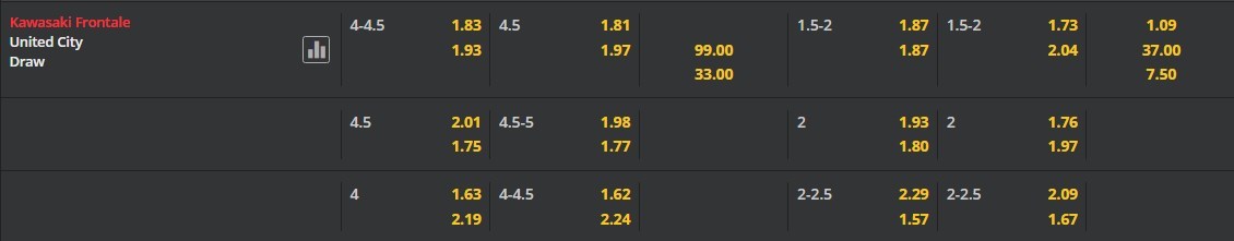 Hàng công của Kawasaki Frontale đang cho thấy phong độ cao khi họ ghi được tới 3 bàn vào lưới đối thủ không hề yếu Daegu ở lượt trận mở màn. Trước một United City thua kém mình khá nhiều về trình độ, Kawasaki Frontale có thể sẽ có thêm 1 trận đấu tưng bừng và ô cược tài sẽ là lựa chọn cho kèo đấu này.