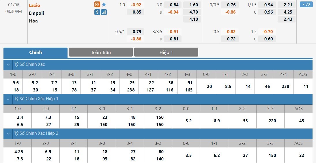 Với lợi thế sân nhà, Lazio sẽ được đánh giá cao hơn Empoli khá nhiều ở kèo đấu này. Tỷ lệ cược của Lazio chỉ là 1 ăn 1.60 trong khi đó Empoli có tỷ lệ cược lên tới 1 ăn 4.70. Tỷ số hòa có tỷ lệ cược là 1 ăn 4.10. Lazio đang có phong độ tốt. Được chơi trên sân nhà trước một đối thủ dưới cơ, Lazio sẽ đủ khả năng để giành được một chiến thắng.