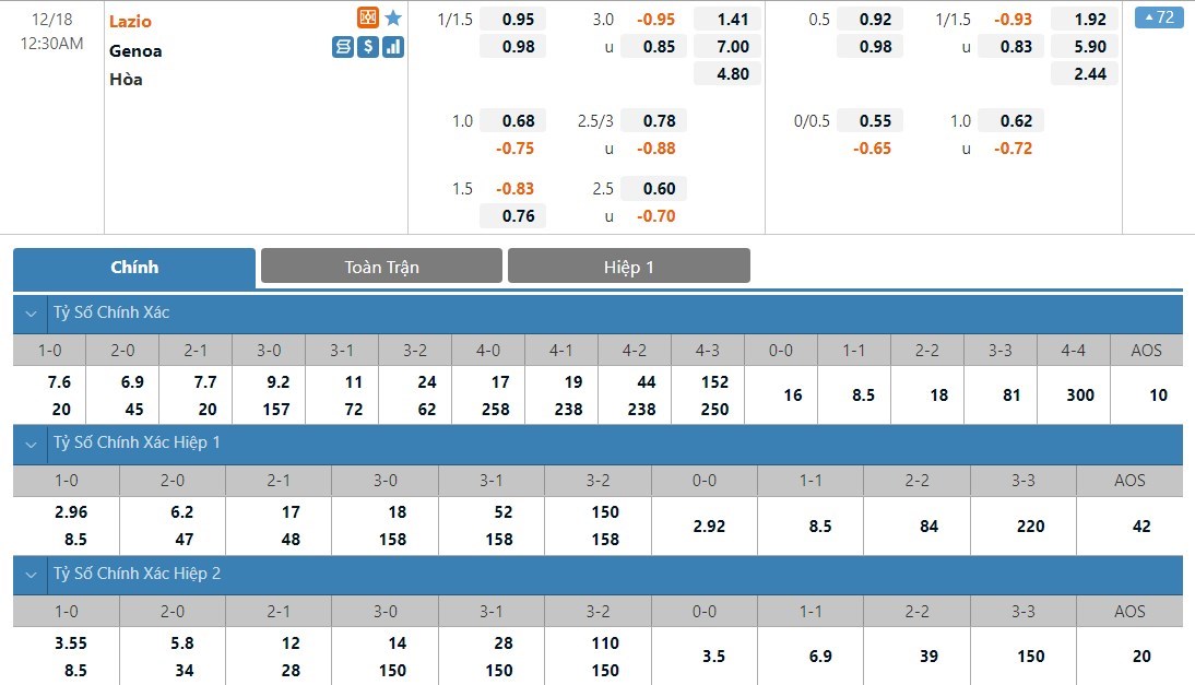 Dự đoán kèo tỷ số hiệp 1: Lazio 2-0 Genoa