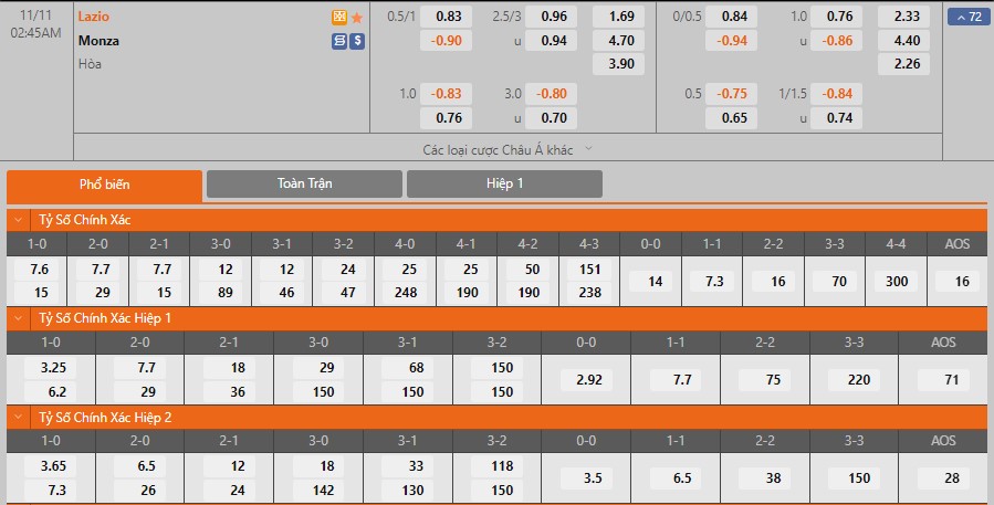 Trong 3 trận gần đây, Lazio chỉ ghi được 2 bàn thắng. Đây là lúc mà Lazio cũng đang có phong độ không quá ấn tượng và họ đang tấn công không quá hiệu quả. Monza cũng không phải đội bóng có khả năng tấn công quá sắc sảo và trận đấu này sẽ không xuất hiện nhiều bàn. Ô cược xỉu sẽ là lựa chọn cho kèo đấu này.
