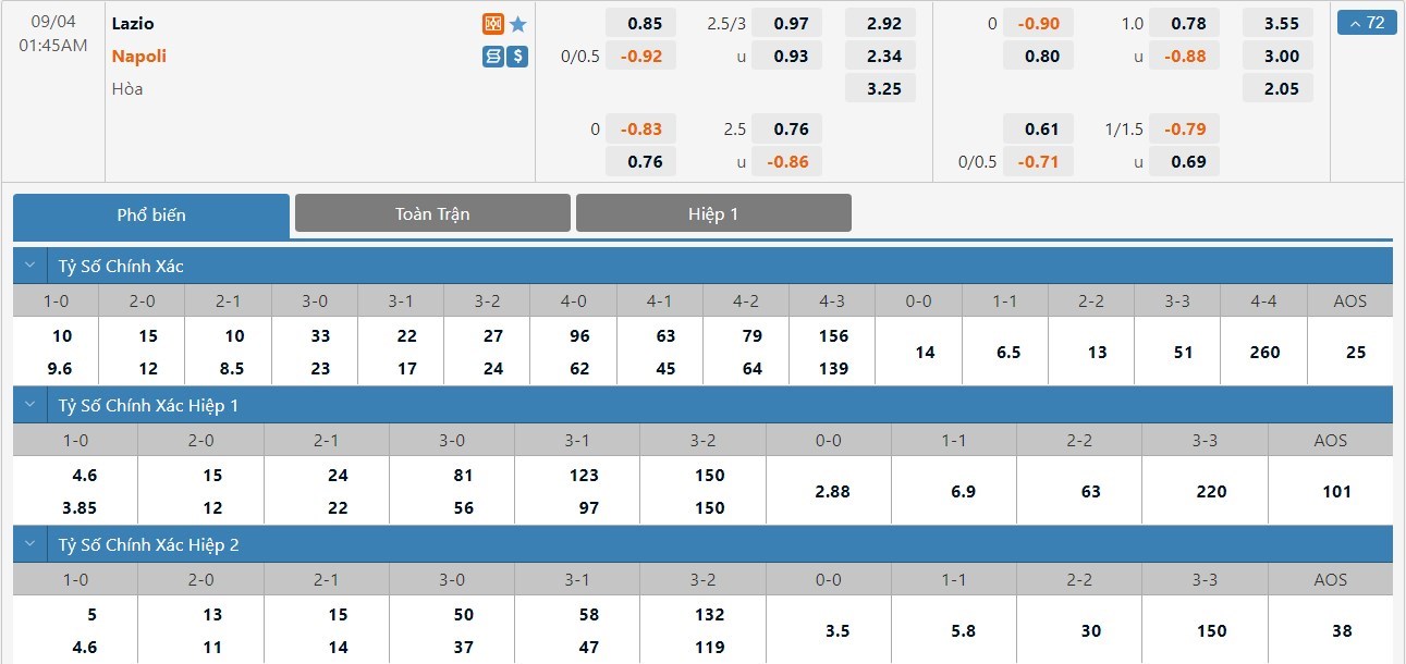 Dự đoán kèo tỷ số hiệp 1: Lazio 0-2 Napoli