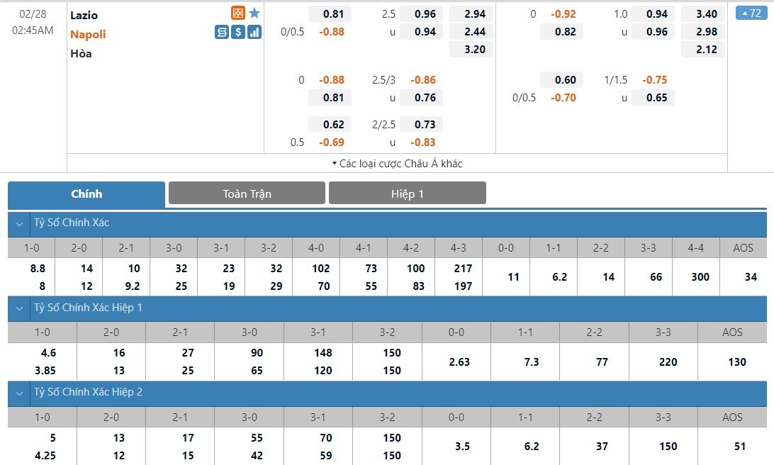 Soi kèo châu Á Lazio vs Napoli