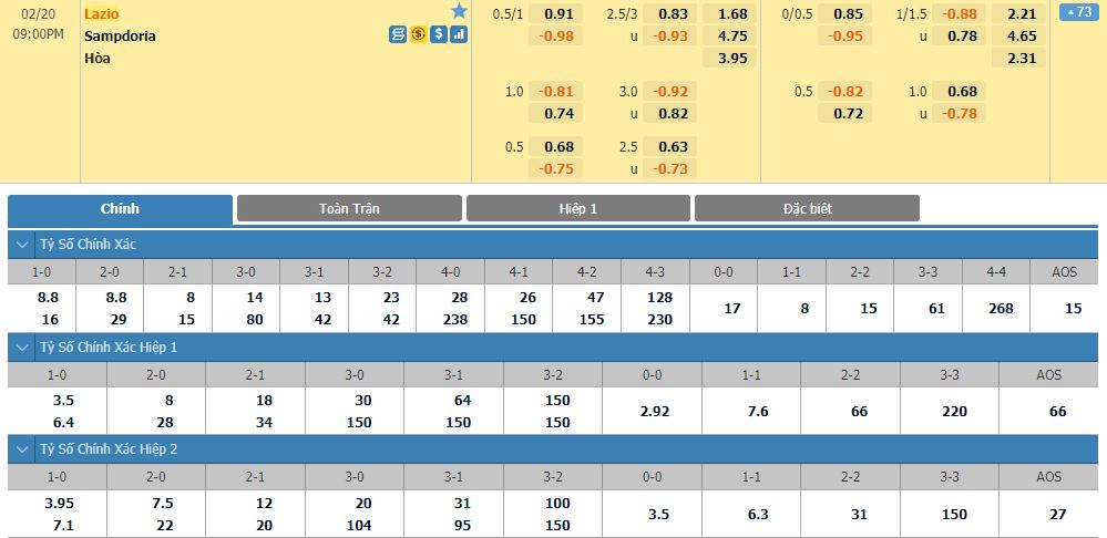 Soi kèo tổng quát Lazio vs Sampdoria
