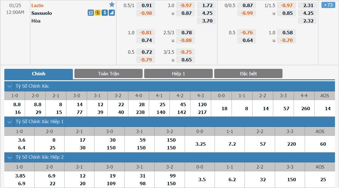Với lợi thế sân nhà, Lazio được đánh giá cao hơn Sassuolo khá nhiều ở trận này. Đội chủ nhà chỉ có tỷ lệ cược là 1 ăn 1.72 trong khi đội khách có tỷ lệ cược lên tới 1 ăn 4.75. Tỷ số hòa có tỷ lệ cược là 1 ăn 3.70. Đây là giai đoạn Lazio đang thi đấu thăng hoa trong khi đó Sassuolo lại tỏ ra sa sút. Đội chủ nhà đang nắm quá nhiều lợi thế và họ được dự đoán sẽ có 3 điểm ở trận này.