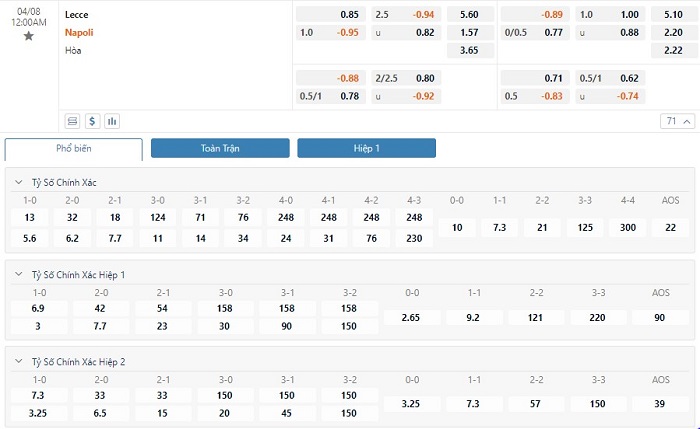 Dự đoán kèo tỷ số hiệp 1: Lecce 0-1 Napoli
