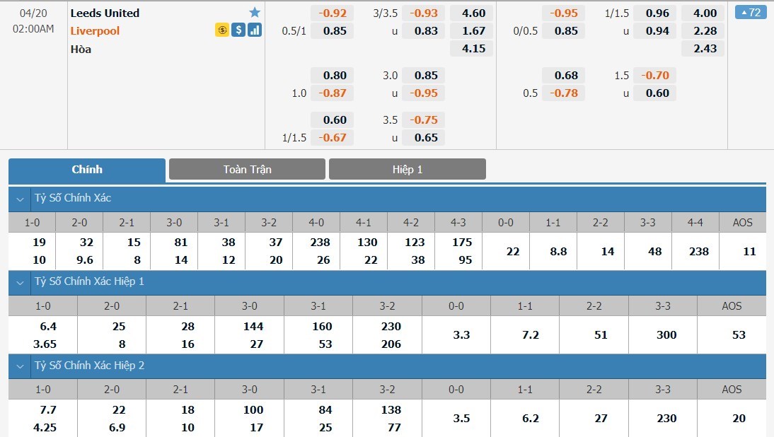 Liverpool vẫn được đánh giá cao hơn Leeds United không ít ở trận này. Đội khách có tỷ lệ cược là 1 ăn 1.67 trong khi đó đội chủ nhà có tỷ lệ cược là 1 ăn 4.60. Tỷ số hòa cũng có tỷ lệ cược khá cao với 1 ăn 4.15. Leeds United đang có phong độ rất cao và đây sẽ là trận đấu ẩn chứa nhiều rủi ro giành cho Liverpool. Ở kèo đấu này, ô cược hòa sẽ là lựa chọn được đánh giá cao.