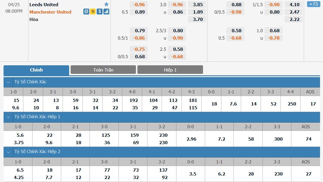 Man United được đánh giá là cửa trên ở trận này với tỷ lệ cược 1 ăn 1.89. Leeds có tỷ lệ cược là 1 ăn 3.85 trong khi đó tỷ số hòa có tỷ lệ cược là 1 ăn 3.70. Man United lúc này đang có phong độ cao và họ vẫn chưa bỏ cuộc trong cuộc đua cạnh tranh danh hiệu vô địch với Man City. Sẽ là rất khó để Leeds có thể tạo ra được bất ngờ và cửa trên Man United sẽ là lựa chọn hợp lý hơn.