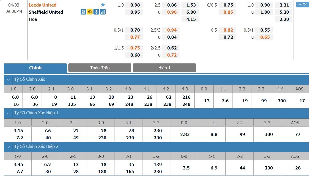 Leeds United được đánh giá cao hơn Sheffield United khá nhiều ở trận này. Đội chủ nhà chỉ có tỷ lệ cược là 1 ăn 1.53 trong khi đội khách có tỷ lệ cược lên tới 1 ăn 6.00. Tỷ số hòa cũng có tỷ lệ cược khá cao với 1 ăn 4.15. Sheffield United mùa này thi đấu quá tệ và đây sẽ là một đối thủ vừa sức cho Leeds United. Trước vị khách quá yếu kém, Leeds United sẽ có chiến thắng ở trận này.