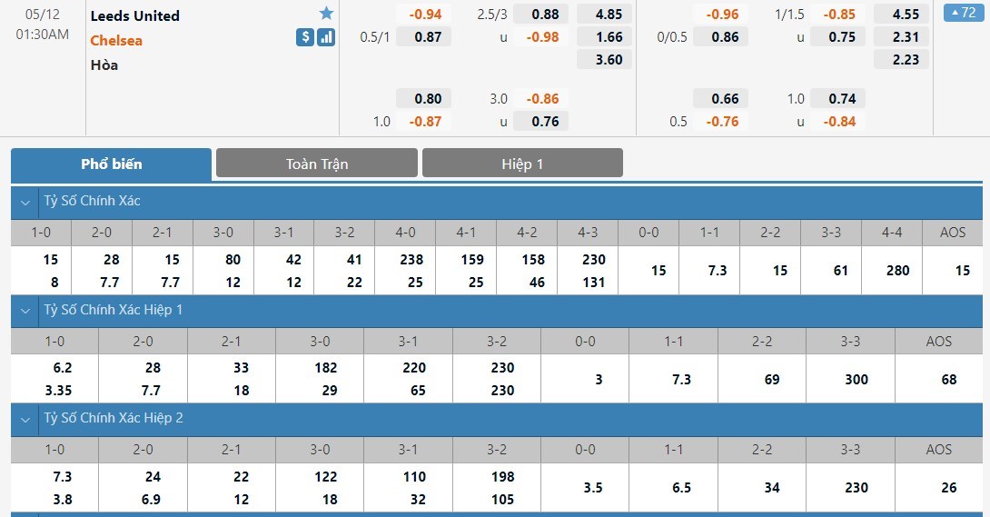 Dự đoán kèo tỷ số hiệp 1: Leeds 0-1 Chelsea