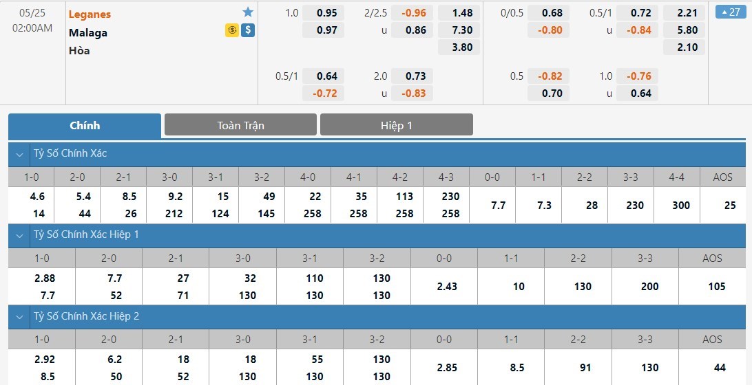 Dự đoán kèo tỷ số hiệp 1: Leganes 1-0 Malaga