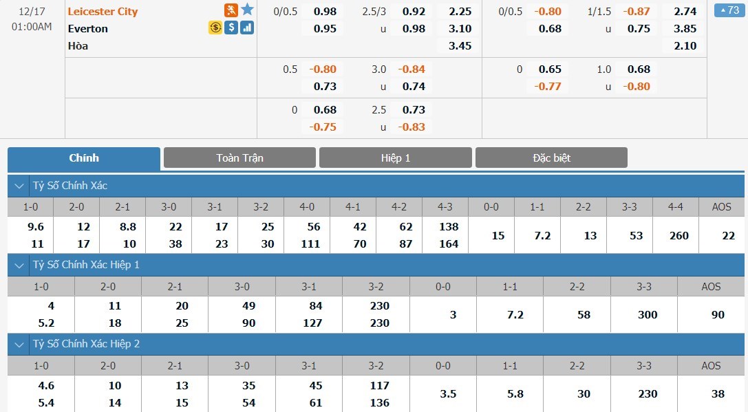 Leicester City với lợi thế sân nhà sẽ là cửa trên ở trận đấu này. Tỷ lệ cược của Leicester chỉ ở mức 1 ăn 2.25 trong khi Everton có tỷ lệ 1 ăn 3.10. Tỷ số hòa có tỷ lệ cược là 1 ăn 3.45. Everton là một cái tên có thực lực tốt ở mùa giải năm nay và họ cũng đang có phong độ khá tốt. So với Leicester, Everton đang không thua kém về thực lực và đây là kèo đấu mà người chơi có thể mạo hiểm với kết quả hòa.