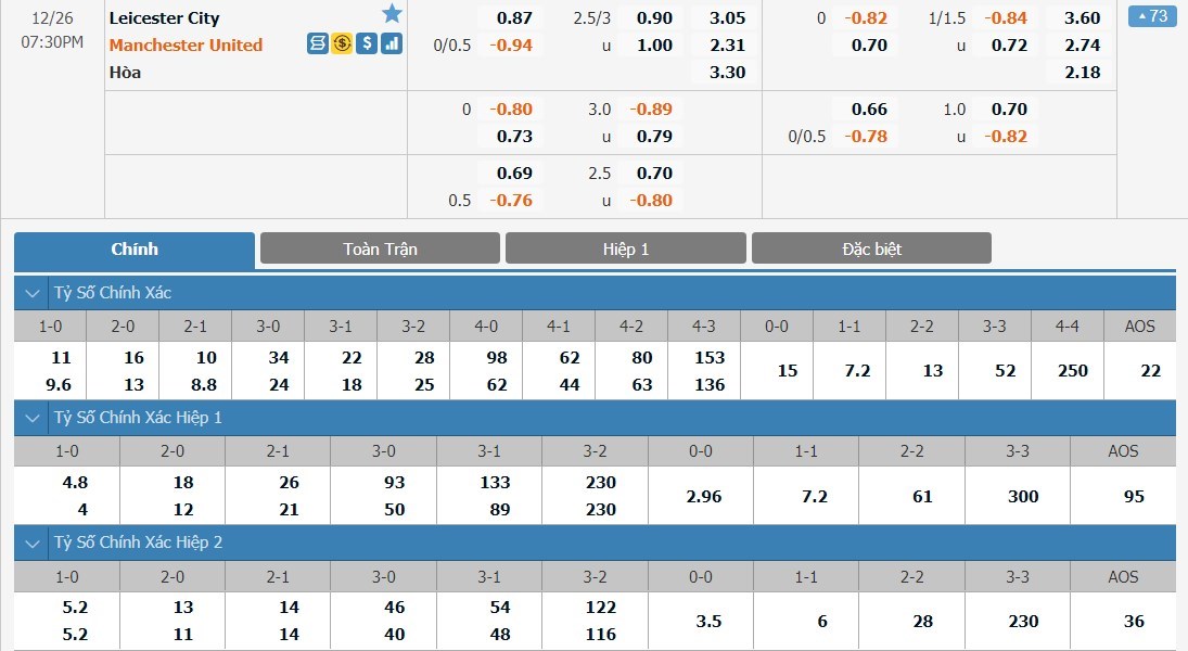 Ở kèo đấu này, Man United được đánh giá cao hơn đôi chút so với Leicester City. Man United có tỷ lệ cược là 1 ăn 2.31 trong khi Leicester có tỷ lệ cược là 1 ăn 3.05. Tỷ số hòa có tỷ lệ cược là 1 ăn 3.30. Leicester là cái tên rất khó chịu ở mùa giải năm nay và họ cũng đang có phong độ cao. Man United sẽ không dễ để có được 3 điểm ở trận này và tỷ số hòa sẽ là lựa chọn hợp lý.