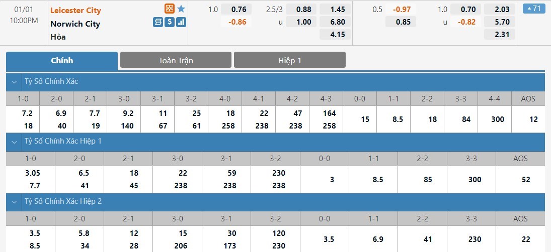 Tỷ lệ cược của Leicester và Norwich ở kèo đấu này sẽ có sự chênh lệch lớn. Leicester có tỷ lệ cược là 1 ăn 1.45 trong khi đó Norwich có tỷ lệ cược là 1 ăn 6.80. Tỷ số hòa có tỷ lệ cược là 1 ăn 4.15. Norwich lúc này vẫn đang tỏ ra quá yếu đuối. Được chơi trên sân nhà trước một đối thủ rất dễ chịu, Leicester sẽ có được 3 điểm ở trận này.