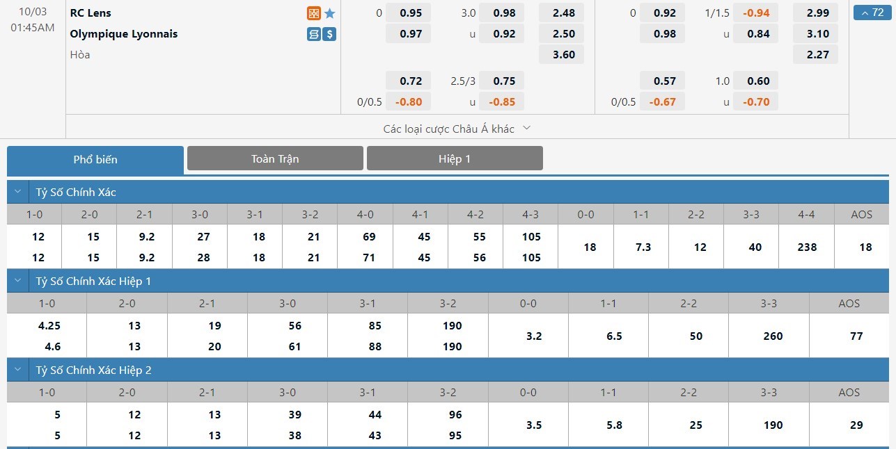 Ở cả 2 lần gần nhất Lens đón tiếp Lyon, trận đấu đều kết thúc với tỷ số hòa 1-1. Đây là lúc mà Lyon và Lens vẫn cho thấy trình độ khá cân bằng và khả năng cao 2 đội ở trận này sẽ tiếp tục giằng co với nhau trong một thế trận kém hấp dẫn. Ô cược xỉu vẫn sẽ là một lựa chọn hợp lý cho kèo đấu này.