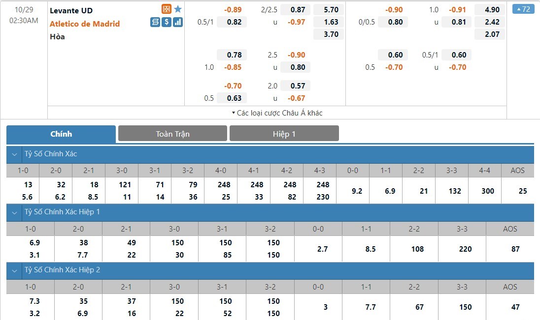 Soi kèo tài xỉu, kèo tỷ số Levante vs Atletico Madrid