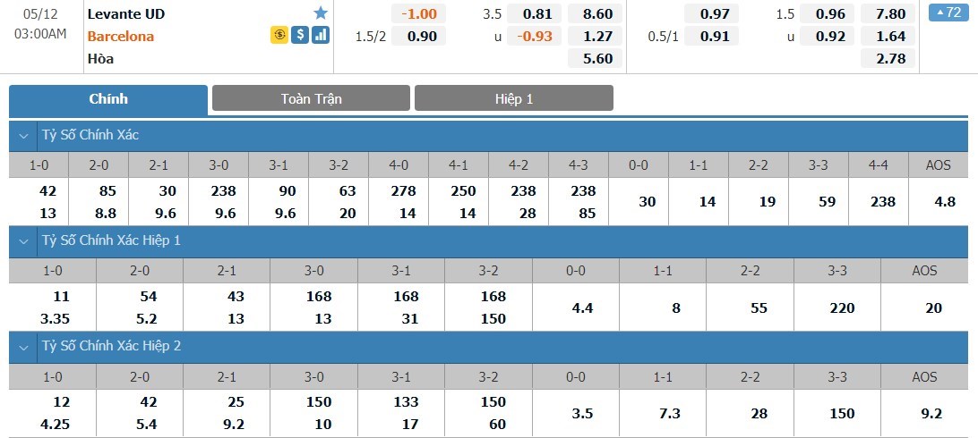 Soi kèo tài xỉu, kèo tỷ số Levante vs Barcelona