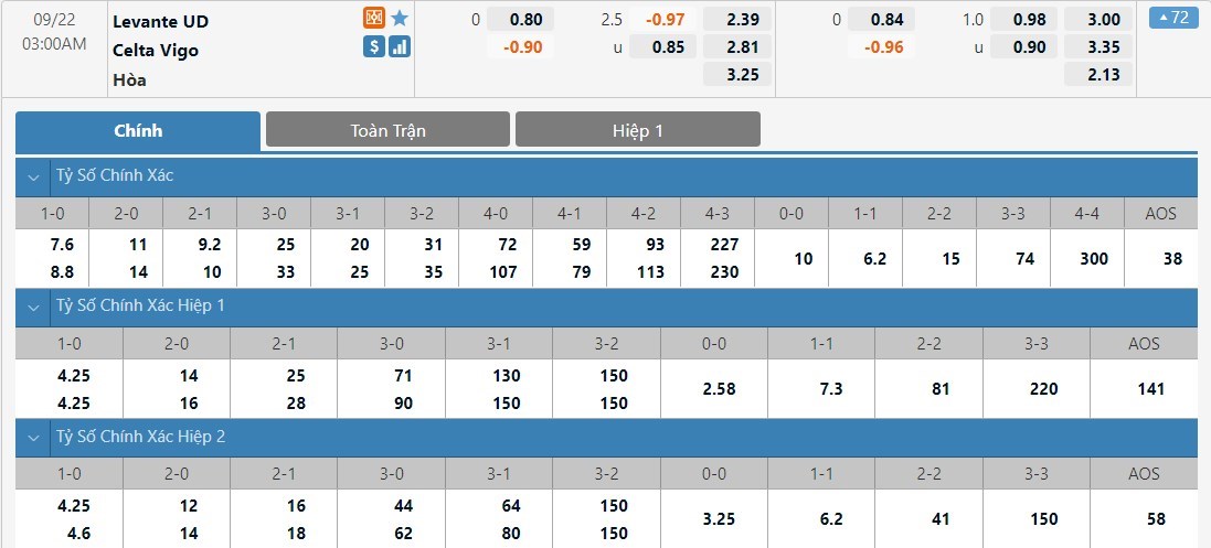 Dự đoán kèo tỷ số hiệp 1: Levante 2-0 Celta Vigo