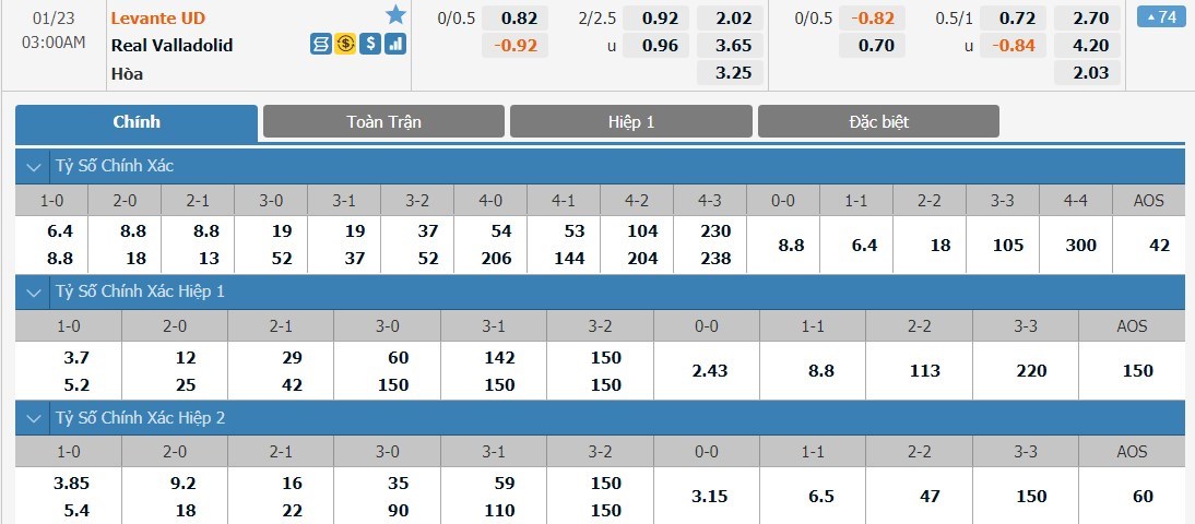 Levante được đánh giá là cửa trên ở trận này với tỷ lệ cược 1 ăn 2.02. Valladolid có tỷ lệ cược là 1 ăn 3.65 trong khi tỷ số hòa có tỷ lệ cược là 1 ăn 3.25. Phong độ của Valladolid ở quãng thời gian vừa qua là không quá tệ. So với Levante, Valladolid cũng đang sở hữu một đội hình có chất lượng không hề thua kém. Hai đội đang tỏ ra khá ngang sức và ô cược hòa sẽ là lựa chọn được đánh giá cao ở kèo đấu này.