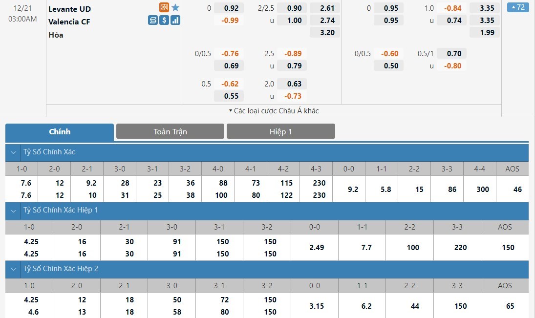 Tỷ lệ cược của Levante và Valencia ở kèo đấu này rất cân bằng. Levante có tỷ lệ cược là 1 ăn 2.61 trong khi đó Valencia có tỷ lệ cược là 1 ăn 2.74. Tỷ số hòa có tỷ lệ cược là 1 ăn 3.20. Hai đội của kèo này đang tỏ ra khá ngang ngửa và với kèo đấu này, ô cược hòa sẽ là lựa chọn hợp lý.