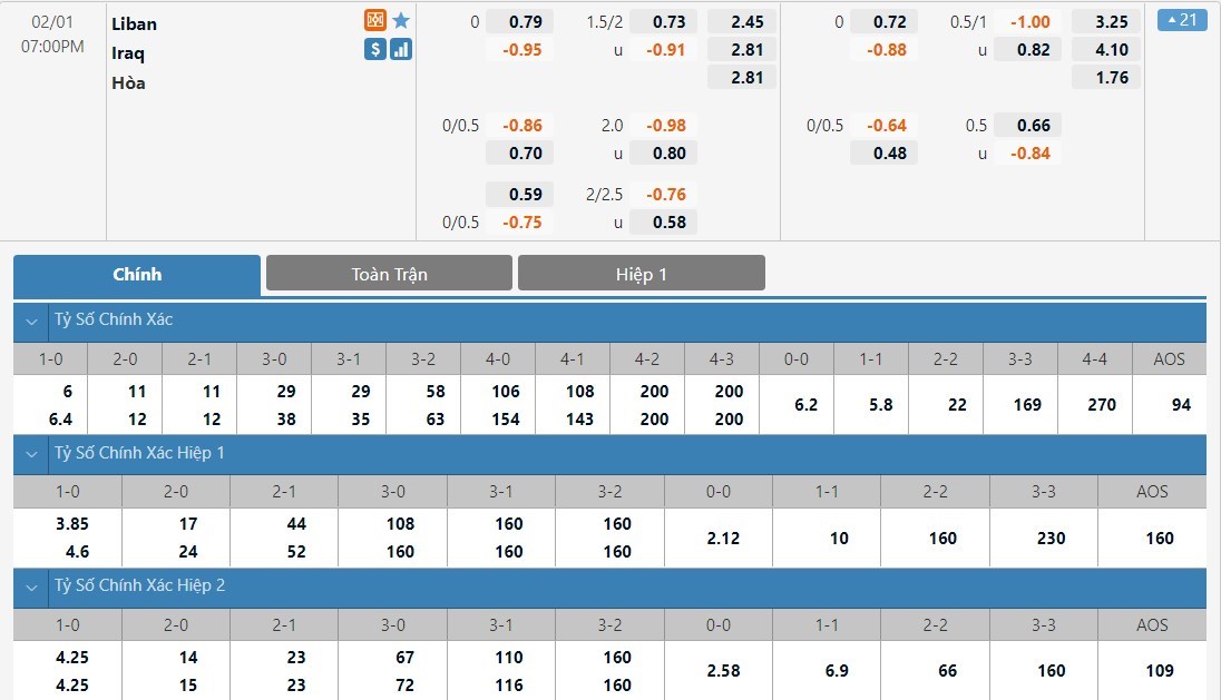 Tỷ lệ cược của Liban và Iraq ở kèo đấu này rất cân bằng. Liban có tỷ lệ cược là 1 ăn 2.45 trong khi đó Iraq có tỷ lệ cược là 1 ăn 2.81. Tỷ số hòa cũng có tỷ lệ cược là 1 ăn 2.81. Hai đội đang tỏ ra khá ngang ngửa về trình độ và ô cược hòa sẽ là lựa chọn đáng cân nhắc ở kèo đấu này.
