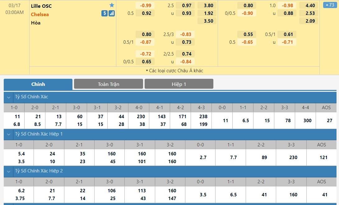 Soi kèo tài xỉu, kèo tỷ số Lille vs Chelsea