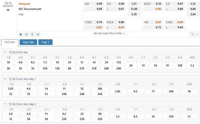 Soi kèo tổng quát Liverpool vs Bournemouth