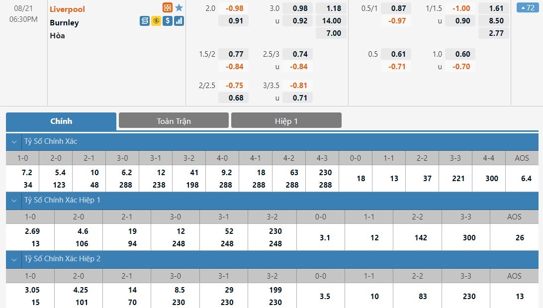 Dự đoán kèo tỷ số hiệp 1: Liverpool 2-0 Burnley