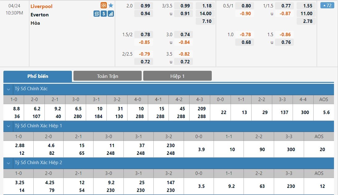 Soi kèo tài xỉu, kèo tỷ số Liverpool vs Everton