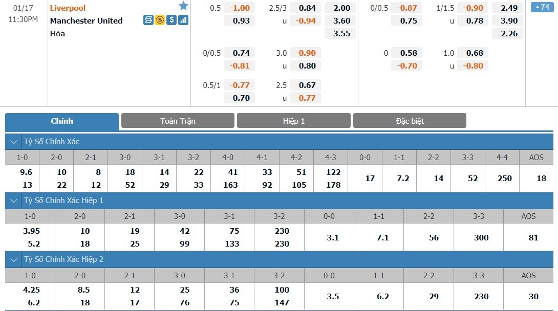Với lợi thế sân nhà, Liverpool được đánh giá cao hơn Man United đôi chút ở kèo đấu này. Tỷ lệ cược của Liverpool là 1 ăn 2.00 trong khi Man United có tỷ lệ là 1 ăn 3.60. Tỷ số hòa có tỷ lệ cược là 1 ăn 3.55. Đây là giai đoạn mà Man United đang có phong độ rất cao trong khi đó Liverpool lại đang tỏ ra thiếu ổn định. Hai đội đang tỏ ra ngang ngửa và kết quả hòa là lựa chọn được đánh giá cao ở kèo đấu này.