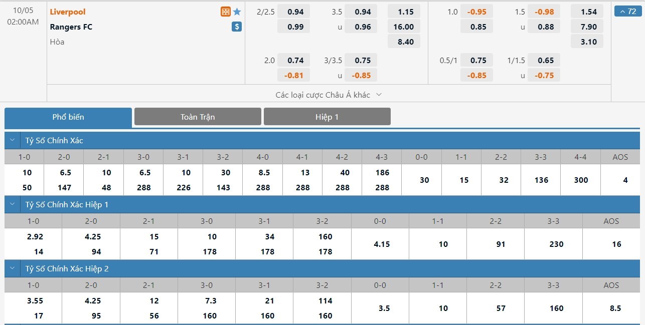 Liverpool sẽ được đánh giá cao hơn Rangers khá nhiều ở kèo đấu này. Tỷ lệ cược của Liverpool chỉ là 1 ăn 1.15 trong khi đó Rangers có tỷ lệ cược lên tới 1 ăn 16.00. Tỷ số hòa có tỷ lệ cược là 1 ăn 8.40. Rangers đang có phong độ tệ. Làm khách trước một đối thủ rất mạnh, họ sẽ khó tạo ra được bất ngờ và cửa trên Liverpool sẽ là lựa chọn cho kèo đấu này.