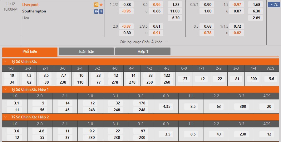 Kèo châu Á hiệp 1: Liverpool -3/4 (HT)