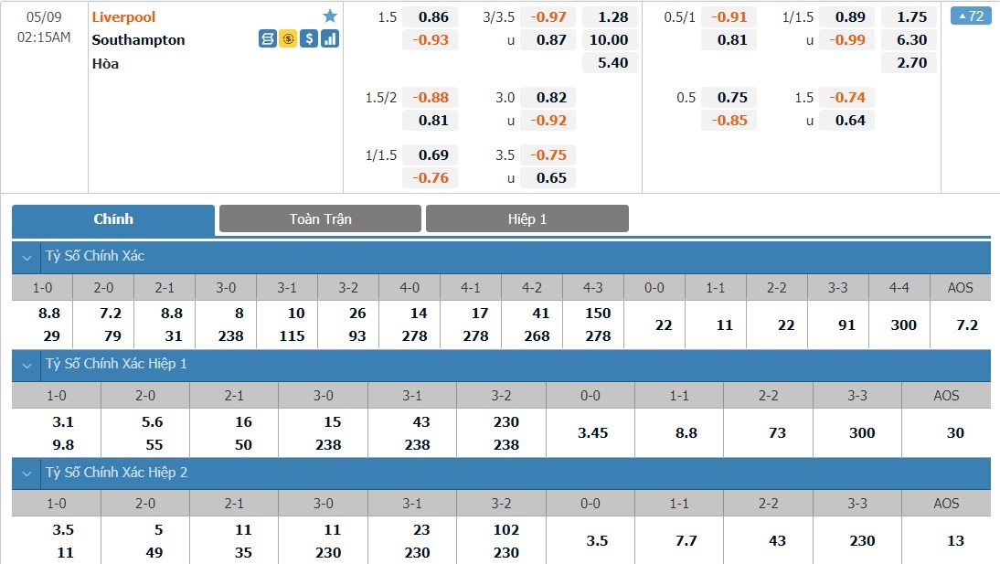 Liverpool được đánh giá cao hơn Southampton rất nhiều ở kèo đấu này. Tỷ lệ cược của Liverpool chỉ là 1 ăn 1.28 trong khi đó Southampton có tỷ lệ cược lên tới 1 ăn 10.00. Tỷ số hòa có tỷ lệ cược cũng khá cao với 1 ăn 5.40. Southampton lúc này đang thi đấu không tốt và họ sẽ khó để tạo ra được bất ngờ trước Liverpool. Trước một đối thủ vừa sức, Liverpool được dự đoán vẫn sẽ có chiến thắng ở trận này.