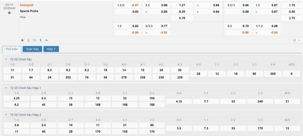 Dự đoán kèo tỷ số hiệp 1: Liverpool 1-0 Sparta Prague