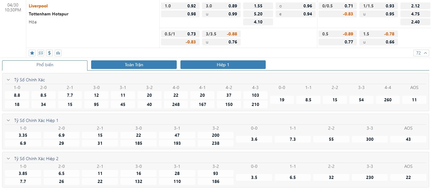Dự đoán kèo tỷ số hiệp 1: Liverpool 1-0 Tottenham