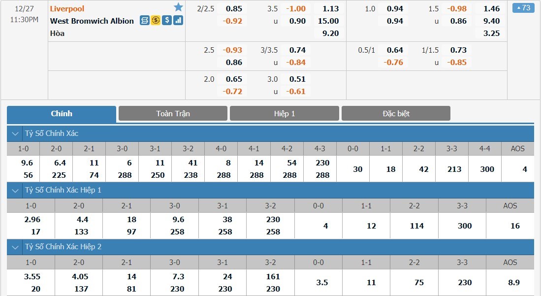 Tỷ lệ cược của 2 đội bóng ở kèo đấu này có sự chênh lệch rất lớn. Liverpool chỉ có tỷ lệ cược là 1 ăn 1.13 trong khi West Brom có tỷ lệ cược lên tới 1 ăn 15.00. Tỷ số hòa có tỷ lệ cược là 1 ăn 9.20. Liverpool lúc này tỏ ra quá mạnh so với West Brom và cơ hội để đội khách có thể có điểm ở trận này gần như bằng 0.